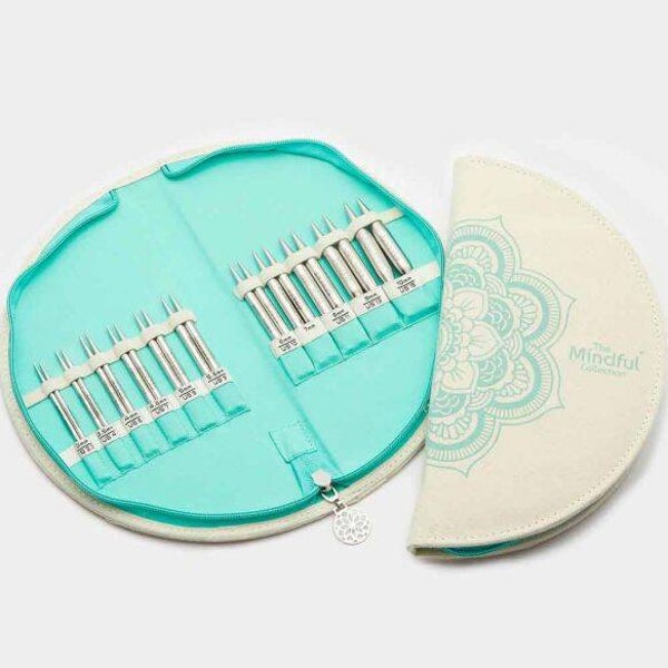 The needle tips are supplied in a semi-circular case that closes with a zipper. On the inside of the case, the needle sizes are clearly marked on the different compartments, so that the needles can be neatly stored. The accessories can be stored in the separate small zippered pouch. The teal-coloured accents and the floral motif on the cases and the accessories are characteristic of the KnitPro Mindful collection.